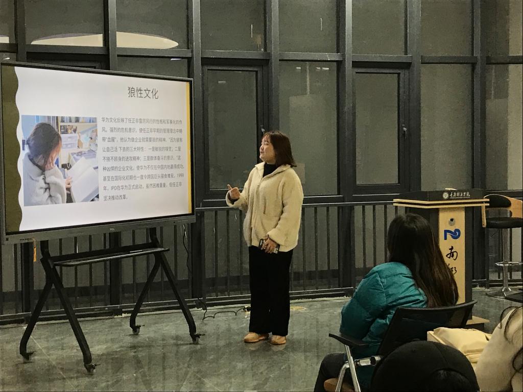 王阅同学带来了《任正非传》的阅读分享。王阅通过趣味性方式作自我介绍,并结合任正非的个人简介,从“坚持”、“狼性文化”、“启蒙老师”三个关键词做了深度分享。