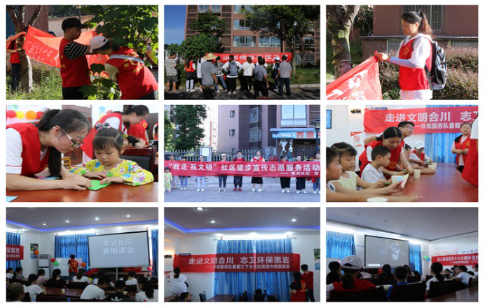 “文明在我心,志愿为他人”。为了践行本次三下乡“走进文明合川,志卫环保黑岩”的目的,“淬炼”服务队开启了第三天的行程。7月20日凌晨,志愿者们热情不减,在黑岩社区附近的小区开始了今天的第一项工作。经过近一个小时的准备,8条关于“文明、环保”的横幅成功展现在大家面前。“ ‘我走我文明’、‘防止争当村霸’ ”等标语深深地走进人们的心理,引导着人们。于此同时,志愿者们积极宣传着志愿者课堂,家长们也闻声带着孩子积极参与。最终志愿者们通过废纸做手工、播放文明环保动漫等方式给小朋友们带去一次有趣且有意义的趣味动手课堂。
