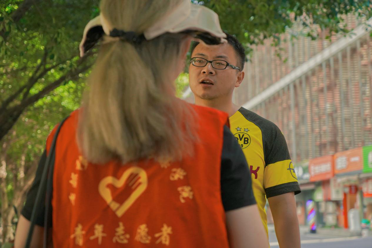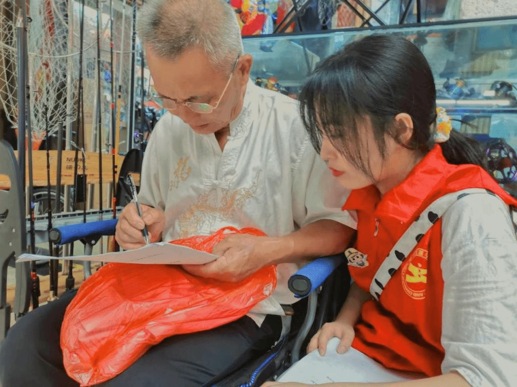 志愿者们在发放问卷中遇见一位八十岁高龄的老爷爷,爷爷头发花白,主动向志愿者询问调研内容。为了将问题看得更清楚,还特意戴上了老花眼镜,一字一句地认真阅读问卷上的内容,这份17道题的问卷共花了48分钟来完成。这是问卷发放以来用时最长、情谊最重的一份问卷。