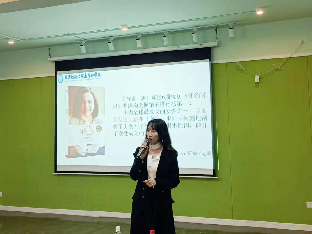 陈瑜洁老师分享了她对于《向前一步》的感悟,她强调主动争取与加强学习能力,并提到;“要学习的是学习能力,所谓学习能力,就是在完全没有某个领域的知识的时候,我们能够用最快的速度把它学会并且能够运用”。强调让同学们勇于挑战自我,突破自我,抓住任何机会来尽情释放自己能力,明确自己的职业规划目标,要善于思考,勇于表达,勇敢向前。