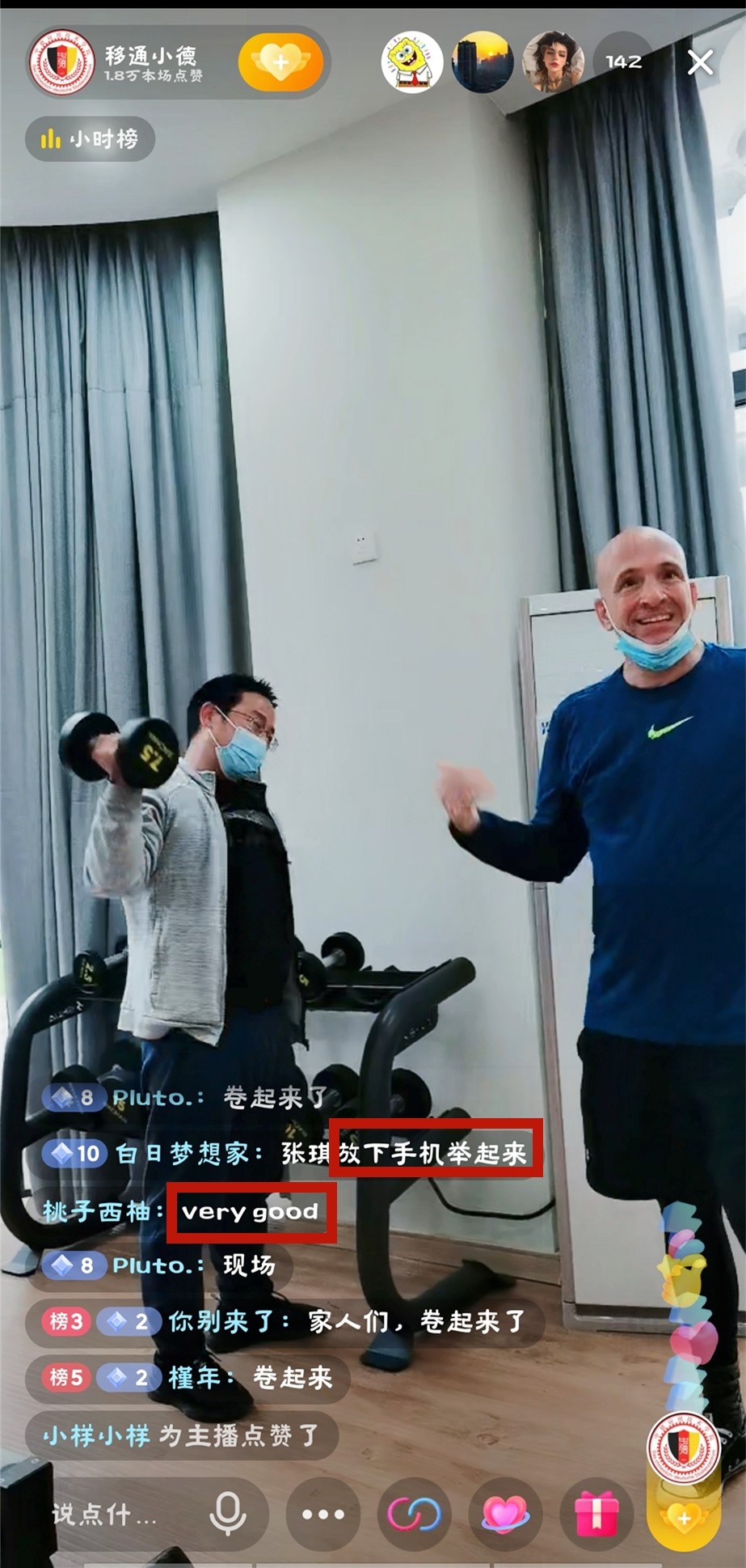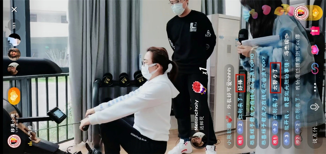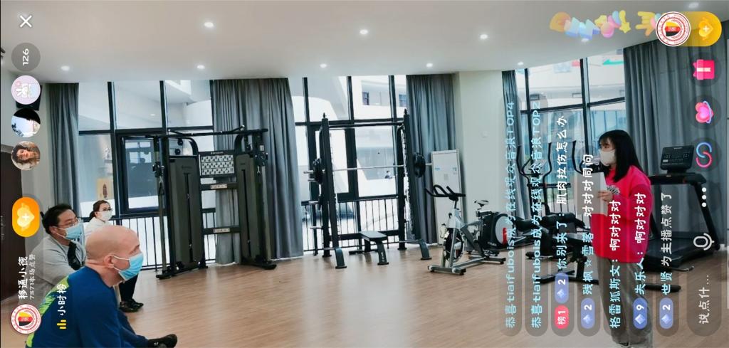 俗话说,时间是生命,运动是性命。在体质健康答疑互动环节后,赵君宇同学向大家介绍健身房的器材使用方法,几位老师已经纷纷站起身准备尝试。尹院长首当其冲,体验锻炼腰部腹部肌肉器械,强度调整到四十公斤也非常轻松地完成了,直播间的同学们连连点赞。侯院长表示自己也经常健身,健身房的划船器十分适合全身运动,在体验过程中也为大家讲解了一些运动心得感受,同学们十分认同。Peter老师兴奋的逐个尝试了每一件器材,小跑到最难的单双杠训练器前,要与两位院长进行比拼。
