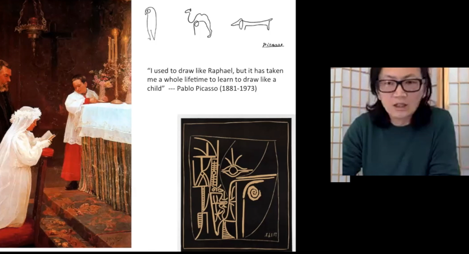 何为民博士以毕加索为例,展示了毕加索绘画的变化。在前期,毕加索的古典绘画是无懈可击的,他在光线、人物构造上是近乎完美的,有的人终其一生或许都难以做到。但后期他的风格发生巨大变化,就如同孩子一笔作画一般,其绘画返璞归真了。