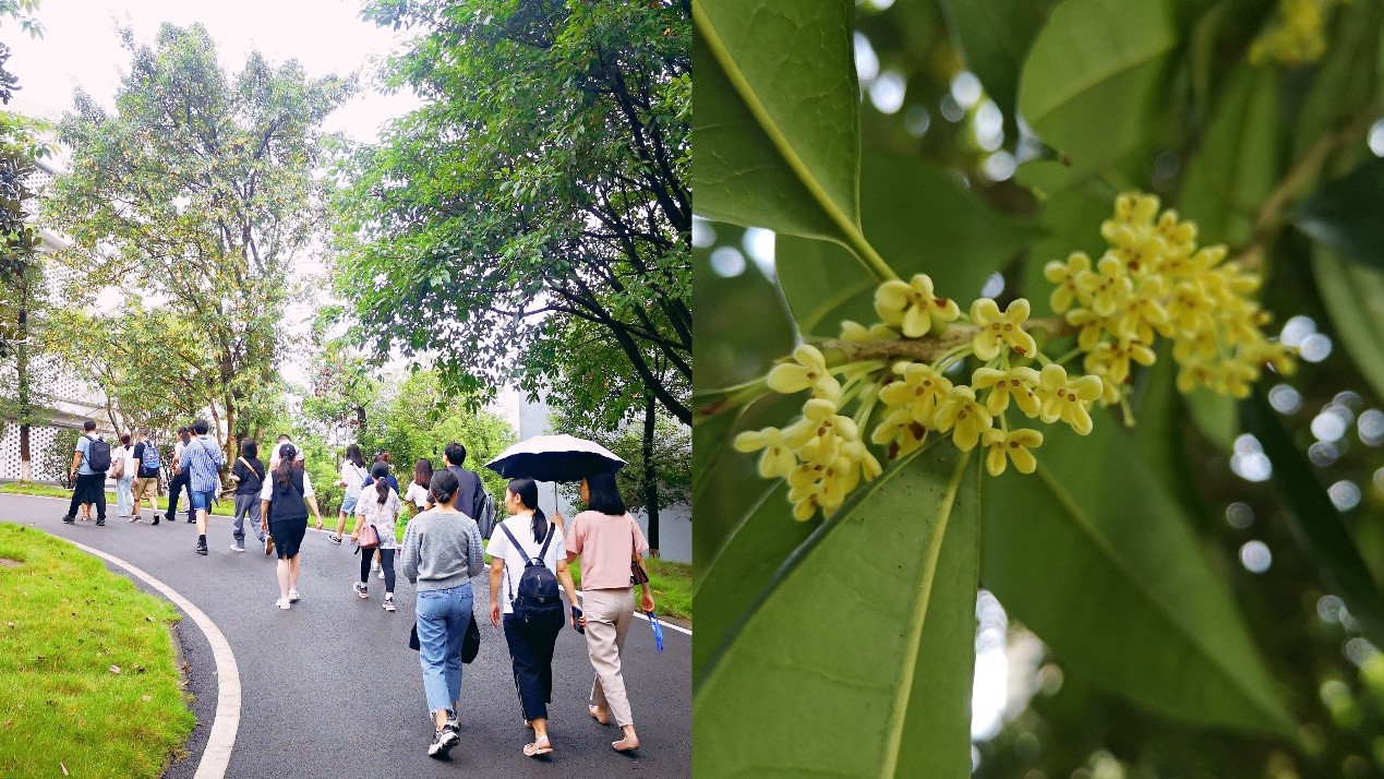 之后我们来到北校区,九月正值金桂开花的季节,路两旁的桂花树发出浓郁的香气,沁人心脾,使人一闻便仿佛醉入其中。在轻松有趣的氛围中,我们一行人去到了汇江楼办公室,熟悉了各自的办公地点。之后一路结伴边聊边走,参观了远景学院、北山书院、双栀书院等各个书院,并试用了多媒体。感叹校园优美风景的同时,我们也感受到了书院的独特魅力,一切都使得我们对新工作充满了期待。