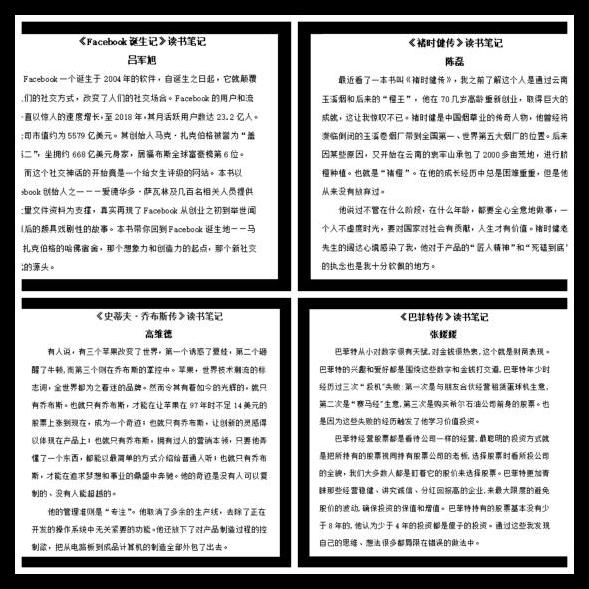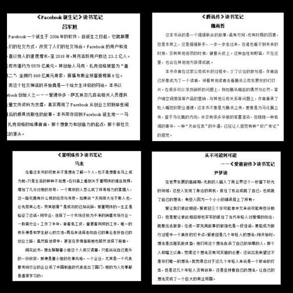 2020级电子信息工程1班的吕军旭同学在《Facebook诞生记》的书评中写道:商业的成功一半来源于合作关系的稳定和合作伙伴的合拍,这一点极为难得,也是成功机遇,或者说是幸运。