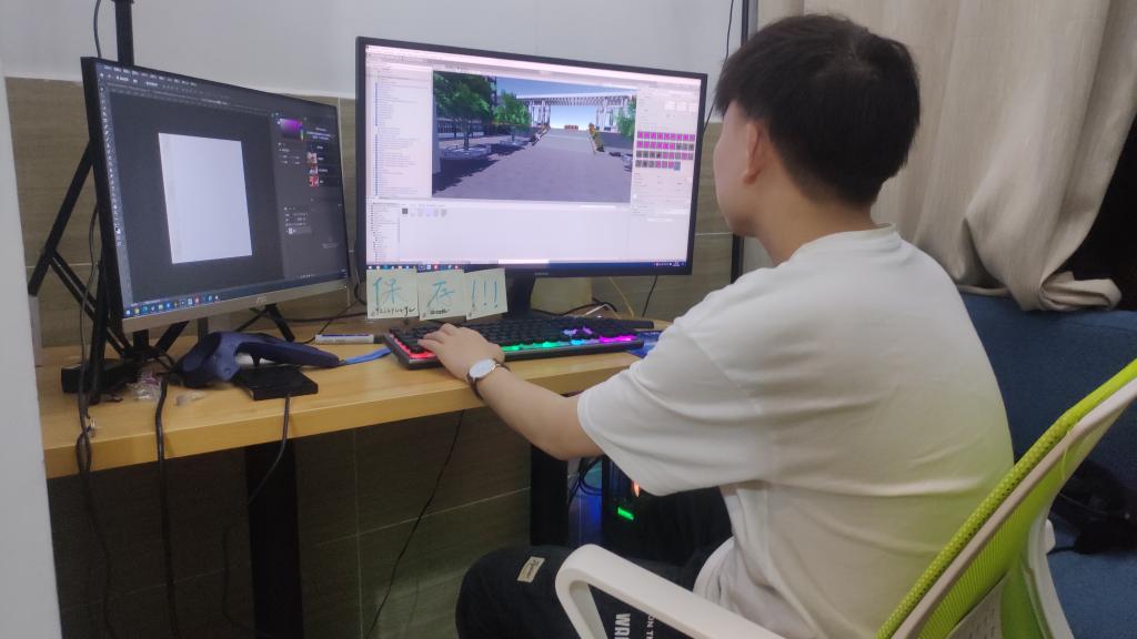于是,工作室的成员们走上开始了漫漫素材采集之路,拍照、扫描、丈量,他们一度自嘲自己是把移通走得最彻底的一群人,2个月时间,他们在素材收集完毕后立即投入了3D建模的工作中,又是2个月时间,在成员们加班加点的努力下,校园大部分建模完成,通过VR眼镜实现了校园漫步,但他们对这样的进度并不满足。