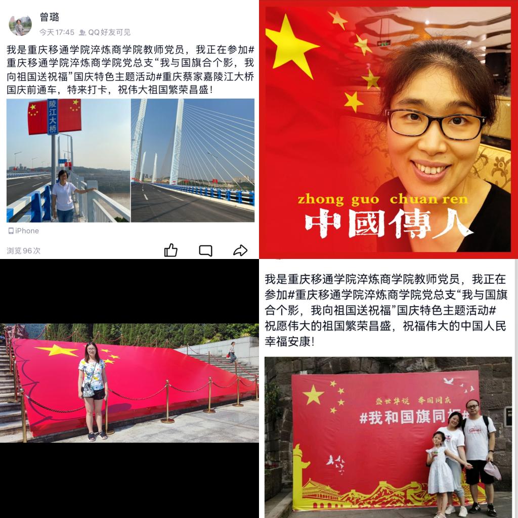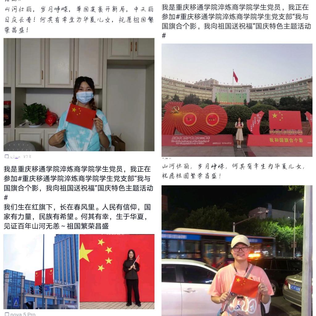 为进一步营造庆祝新中国成立72周年浓厚氛围,推动国庆黄金周发展成为师生积极参与的爱国活动周,形成国庆新民俗,激发广大青年和师生党员的爱国情怀,使广大师生在享受国庆长假的同时做到“知史爱党,知党爱国”。在学校党委的号召下,淬炼商学院党总支的统一部署下,我院全体师生党员和团学干部于2021年十月国庆期间开展“我与国旗合个影,我向祖国送祝福”国庆特色党团主题活动。