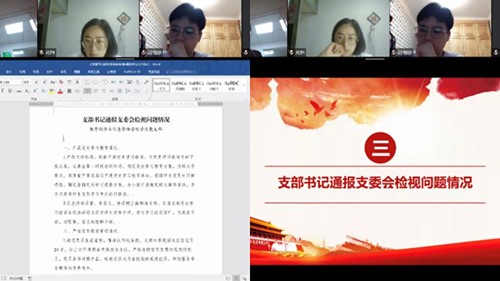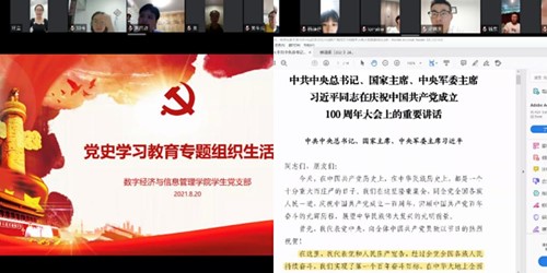 8月19日下午7:30,数字经济与信息管理学院学生党支部紧紧围绕“学党史、悟思想、办实事、开新局”为主题,线上组织召开党史学习教育专题组织生活会。大会共分为五个议程:学习习近平总书记在庆祝党成立100周年大会上的重要讲话、支委会报告开展党史学习教育情况、支部书记通报支委会检视问题情况、全体党员依次作个人对照检查、党支部书记作表态发言。会议由王瑞老师主持,出席会议的有学生党支部书记任瑞娟老师及全体党员同志。