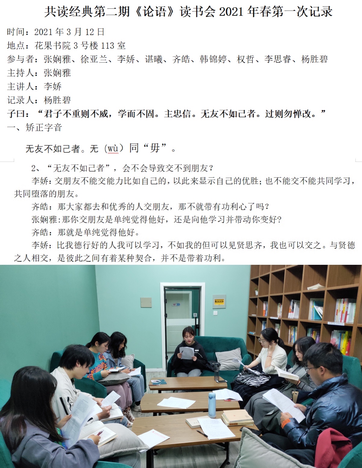 我校通识课程的展开目标之一即培养学生成为“完整的人”,有多门课程围绕道德承担与价值塑造展开,如:《正义论》、《幸福课》等课程。而我所担任的课程《苏格拉底、孔子所开创的世界》隶属“人文精神与生命关怀”板块,该课程亦关涉对道德生活、人文价值的体认。在此门课程中,我们以中西方两大哲人的思想为线索,和同学一起精研原典,探讨德性生活、人伦话题,务求践行所学。暑假讲读所获,虽未必能全部地增入我所任教的课程之中,但对于现而今自己教师的身份之担当,思之颇多,常自勉之,望不愧此职。