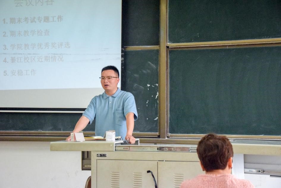 首先由闫会峰副院长通报本学期期末考试专题工作。为迎合期末教学检查,学校领导、督导、教务以及学院领导展开关于严抓期末考试考风、违纪、违规现象的网上巡查。特别强调老师们监考的相关事宜以及学生考试问题,考试过程中更要严把关、诚信风,杜绝出现不良行为。