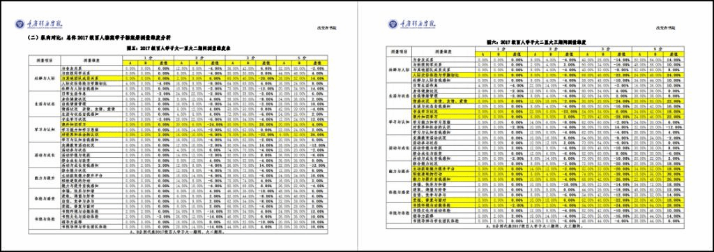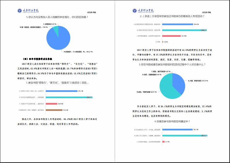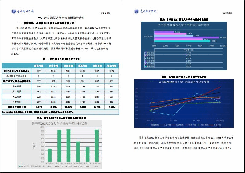 “让改变持续发生”是书院百人项目育人过程中的真实追求,“改变着”是学生成长过程中的真实动态。通过对2017级百人学子《书院学生成长档案册》进行抽样采集,学生学年自评分对比显示每个书院2017级百人学子学年分值都呈稳步上升趋势,平均成长率7.57%,尊重并落实学生成长规律。并在99%的调研覆盖率显示92.2%的学生通过百人项目个人综合能力得到提升,与没有加入百人成长档案项目的学生相比区别很大。通过数据、调研、评估、总结,一串串数据诠释着百人学子在每一个清晨到黄昏、每一个傍晚到黎明的的浸润、改变和成长。(具体报告数据详见附件1)