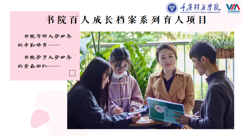 重庆移通学院为全面落实“三全育人”理念,2017年起探索实施书院百人成长档案项目,由学生作为成长档案中的创建主体,是学生自我全面反思和评价的过程。2017年,重庆移通学院书院迎来了首批百人学子,记录了学生四年的书院生活、完满体验、专业学习、朋辈互动、师生陪伴,诠释着百人学子在每一个清晨到黄昏、每一个傍晚到黎明的的浸润、改变和成长。