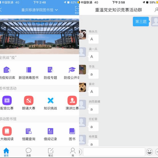 重温党史—挑战知识,利用超星学习通app开展重温党史—挑战知识环节,同学们通过抢答的形式将答案发到交流组中,根据速度和准确性进行评判,考察对党史的了解情况。书中寻宝—挑战技能,参与的同学根据抽到的图书书目,快速的到图书馆书库中查找图书,以速度最快者取胜,考察对图书中图法和书库图书分布的掌握情况。运气比拼—挑战机会,参会的同学将名字填入抽奖箱中,嘉宾现场抽取名字,幸运者胜出,完全靠自己的运气。