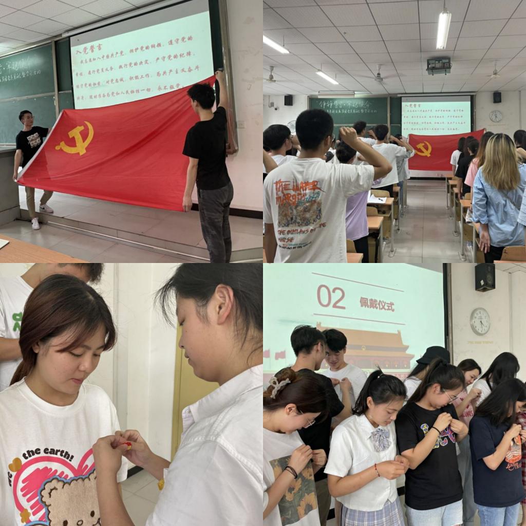 一枚金色党徽,不仅是党员身份的象征,更是一份责任与担当,代表着全心全意为人民服务的初心和使命。风采展示环节结束后,党支部正式党员首先为新发展的预备党员佩戴党徽,向其讲解佩戴党徽的要求和规范,并对大家加入到党组织表达祝福和期盼。随后,全体党员同志面对党旗,庄严肃穆,紧握右拳,高举右手,在王心玥同志的领誓下庄严宣誓,一字一词铿锵有力,回荡在教室,强烈表达着对党组织的敬意和对党员身份的维护。