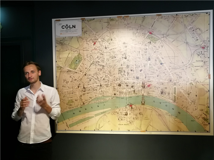 绕过教堂,我们走进了“TIME RIDE”VR展览馆。展览馆虽然小,但却透着浓厚的历史气息。透过固定在墙壁上的3D眼镜,几张3D照片映入眼帘,那是几百年前的科隆,古老且典型的西式街道、身着复古的西装且彬彬有礼的绅士,还有仿佛可以听到蒸汽机的声音的老式火车,无一不透露着这个城市深厚的文化底蕴。随后这里的工作人员通过一张地图向我们详细的介绍了科隆这个城市的魅力,不大不小的地图、阡陌纵横的街道,仿佛是在用上千年独特的话语述说一段久远的故事……然后我们观看了一段影像资料,科隆历史最早要追溯到公元50年代的古罗马时代,苍桑变化、朝代更迭,造就了今天的香水、贸易、朝圣之都,这是一个古老且庄重的城市。我们戴上VR眼镜,坐上时光倒流的列车,回到几百年前的科隆。乘着现代早已淘汰的老式轨道车,看着街道一旁的林林总总,感叹这个城市独有的惬意与舒适。