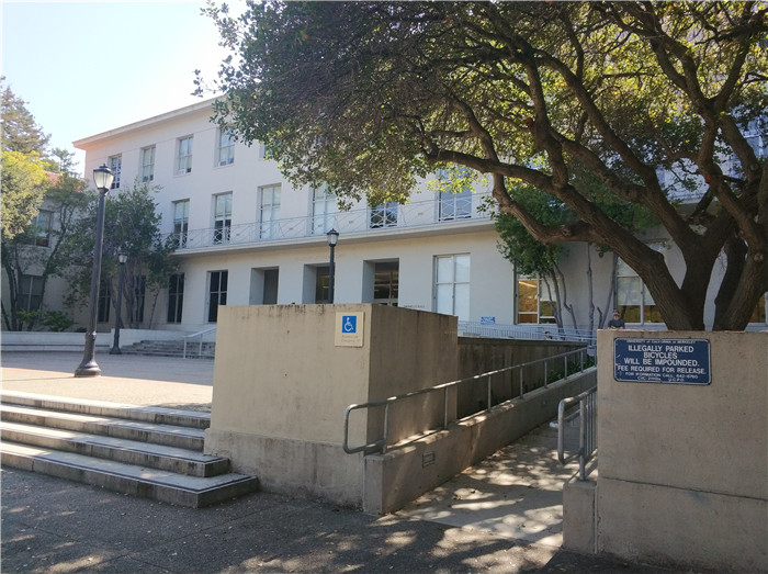 刚来伯克利分校时,我们发现在校内看似普通的建筑里其实有很多人性化的设计。几乎每栋建筑都有无障碍通道,每一间教室,包含阶梯教室也会在教室的两边铺设无障碍通道和扶栏。几乎每一扇公共区域的门外都会设置残疾人感应开关,轻轻触碰门就会自动弹开。