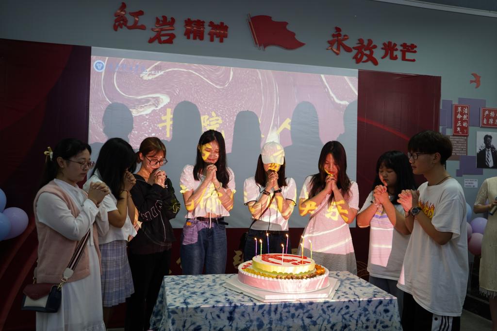 今天的幸福生活,离不开革命前辈们的艰苦奋斗。为感念先辈,点缀着红薯、土豆、玉米等食粮、环绕着“书院家人祝你生日快乐”等字样、刻画着党徽、数字100等元素的生日蛋糕,被缓缓地推向主舞台,惊艳了不少人。25名寿星纷纷许下美好的祝愿,共同吹灭蜡烛,和现场所有人分享着幸福与甘甜。“现场的布置太温馨了,让我有一种回到家里的感觉,这是我第一次陪同室友参与生日会,很是开心和感动,希望明年我的生日也能在书院度过。”寿星的亲友团,在活动现场分享了他们的感受和心得。