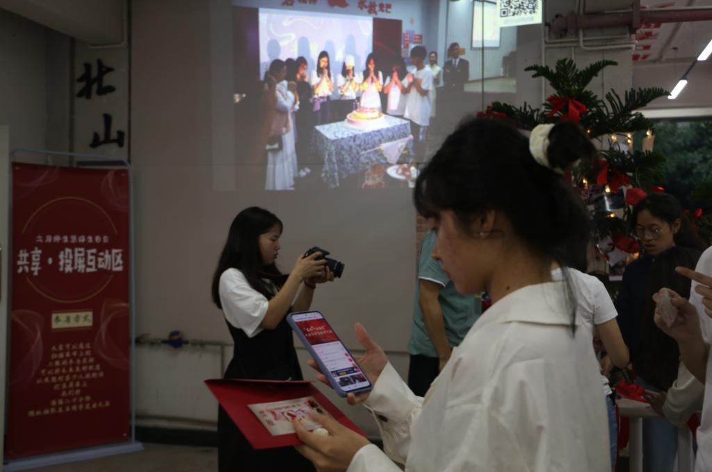 党史竞答区,100道党史题库,引导学生追溯党的百年历程;甜品烘焙区,土豆、红薯、玉米等食材制作的糕点,赢得了现场所有人的青睐,忆苦思甜,不忘来时路,平凡的食材,是对革命先辈的感念和崇敬;投屏互动区,是北山书院首次采用的户外即享图片直播,随手一拍,会客厅的盛况,能实时经过处理展现在屏幕墙上,100张不同角度的寿星笑脸,吸引了大众积极的参与和互动;祝愿树许愿区,100余条“期末不挂科”“祝我的室友生日快乐”“书院老师,永远的家人陪伴者”等心愿和祝福,被高挂在挺拔的松树上,同时,还有100张寿星的生活照,也点缀其中,画面格外温馨与动人。