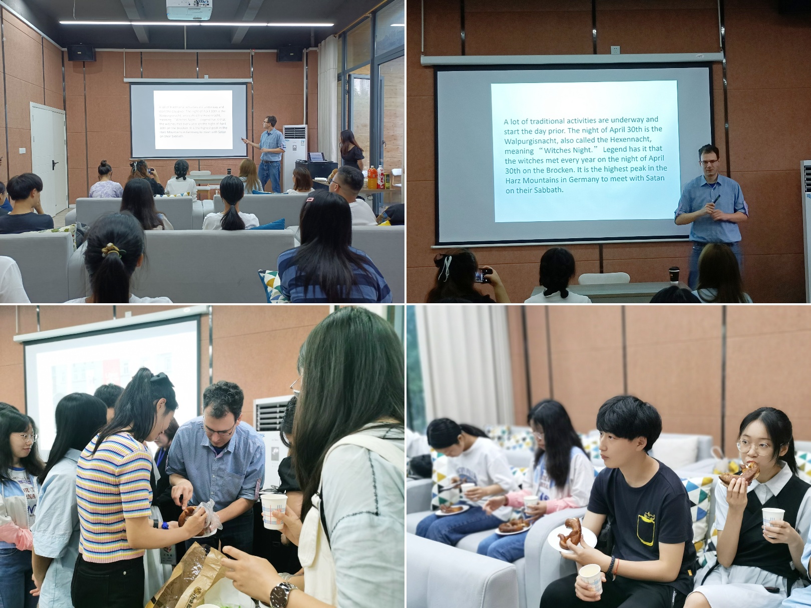5月19日晚上七点,第二场沙龙活动由德国外教Elias在鱼城书院为同学们带来了一场德国传统节日"May Day"的体验式分享,讲述他与“May Day”的故事。从“五月舞”——人们围绕着一个大篝火为了驱赶邪恶的鬼魂和幽灵的舞蹈,到啤酒盛宴,再到给人惊喜味觉体验的“巴伐利椒盐卷饼”,这些“May Day”的传统习俗都表达了德国人民对生活的期盼与热情。外教Elias还幽默地指出千万不要将SOS的mayday与节日“May Day”混淆。