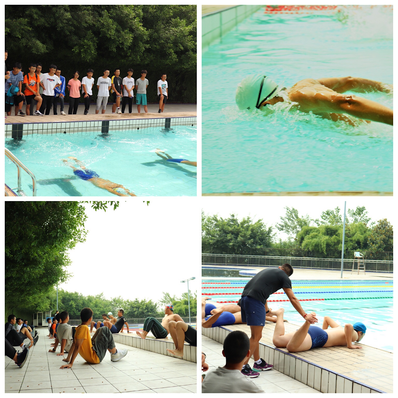 在胡垚老师的游泳课堂上,胡老师首先在岸上示范蛙泳的动作技术,接着让助教下水示范并让同学们认真观察,学生们在岸上学习蛙泳练习动作时很投入,课程进行的非常顺利。