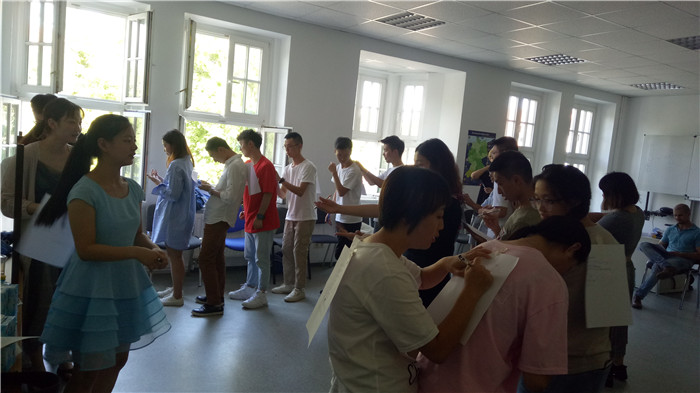 结束了上午的课程,吃过午饭稍做休息,继续由Stefan老师指导我们下午的跨文化交流课程。Stefan老师把所有人随机分为两个组,站在凳子上才告诉我们游戏规则:按照年龄大小从左到右排序,只能在凳子上移动,脚不能碰地。我们很轻松地快速完成。Stefan老师说,我们每个人就好比一种文化,每种文化都会有碰撞,但是完成一项任务总会需要多种文化交流沟通、齐心协力,保持着一颗开放的心,才能够完成。