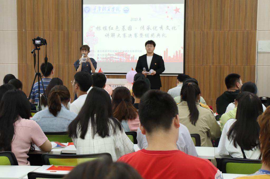 在重庆移通学院党委指导下,由地域文化与城市发展研究院主办,重庆移通学院机关第三党支部、钓鱼城历史文化博物馆、钓鱼城研究会承办的2021年“根植红色基因•传承优秀文化”讲解大赛于2021年5月21日下午16时,在天渠书院111报告厅圆满落幕。本次决赛邀请到了重庆移通学院机关第三党支部书记、工会主席、图书馆馆长秦代辉老师,重庆移通学院地域文化与城市发展研究院院长位光辉老师,重庆移通学院团委姜馨怡老师,重庆移通学院地域文化与城市发展研究院办公室主任陈巧蓉老师,重庆移通学院地域文化与城市发展研究院冯懿老师担任评委,同时莅临决赛现场的嘉宾还有重庆移通学院地域文化与城市发展研究院杜春梅老师、罗晓霞老师。本次大赛由乔杨、孙略两位同学主持。