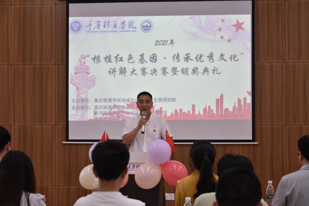 颁奖仪式结束后,重庆移通学院机关第三党支部秦代辉书记为本次大赛作了总结。秦馆长表示本次大赛的主题“根植红色基因•传承优秀文化”与建党一百周年和今年的学党史教育活动非常契合。同时,秦书记也认为讲解大赛很符合学校的办学定位以及人才培养模式。