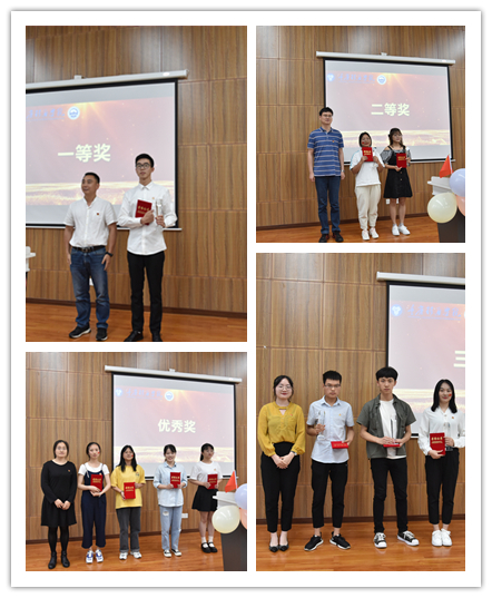 重庆移通学院机关第三党支部秦代辉书记为获得一等奖的同学陈永明颁发奖杯及证书。地域文化与城市发展研究院位光辉院长为王芹、钱胜香等两名同学颁发二等奖奖杯及证书。姜馨怡老师为黄昊楠、王艺静和黄龙林等三名同学颁发三等奖奖杯及证书。陈巧蓉老师黄洋琪、何露露、向腾和蔡陆雯颁发优秀奖。