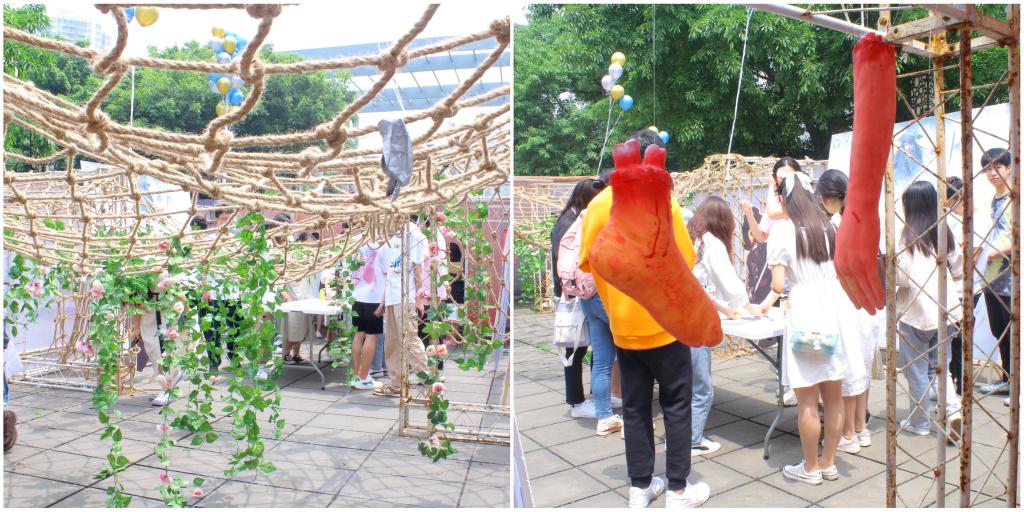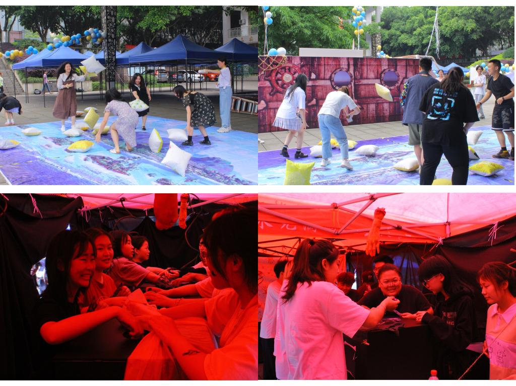 实施“枕救计划”,挑战恐怖箱。打破诅咒后,参与者将来到最激烈的游戏之“枕”救计划。挑战者必须通过三轮枕头大战,才能夺得黑珍珠碎片。现场火爆异常,欢笑声不断,同学们尽情宣泄自己的压力、焦虑,享受难得的畅快与轻松。通过“体力”考验后,参与者们来到最后一关--恐怖箱。此环节不仅箱子里满含未知恐惧,场地悬挂的布置也让整个气氛神秘而诡异。需要依靠参与者内心的力量,克服恐惧勇敢地面对未知。