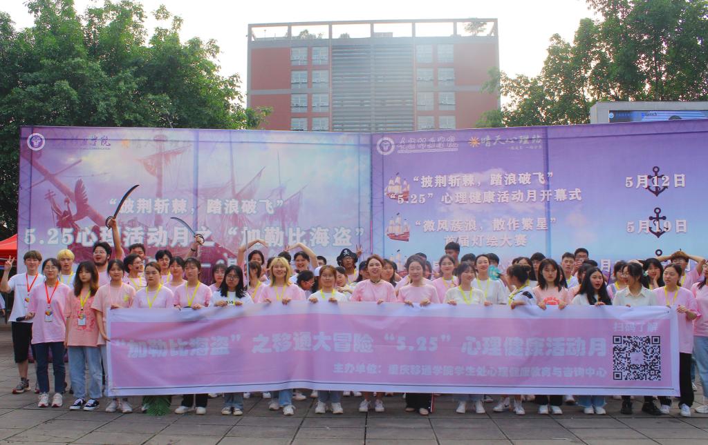 5月12日11:45分,由重庆移通学院学生处心理健康教育与咨询中心主办的“加勒比海盗之‘披荆斩棘,踏浪破飞’5.25心理健康活动月开幕式”在黄桷树广场震撼开幕。本次活动以迪士尼著名电影“加勒比海盗”四部曲为主线,结合积极心理学24项积极心理品质之“勇气”,面向全校师生开展了时长近六个小时的活动,共计1200人参与其中。