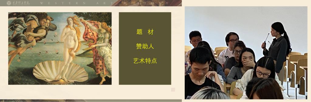 颜昌义老师首先从城市国家、商业经济繁荣、思想转变、历史遗产等方面讲解了意大利文艺复兴兴起的大背景。然后,赵丹老师以波提切利的作品《维纳斯的诞生》为切入点来回应历史,提问并与学生互动:“一提到文艺复兴你会想到什么”、“艺术与历史有什么关系”、“艺术与文明进程的关系”。在讲解的过程中,赵老师以作品的题材、赞助人、艺术特点三个方面来引导学生理解“艺术——历史”,其中也包含了“如何正确地欣赏一幅画”的子问题:题材从where(来源)、who(谁)、why(为什么是她)三点详细展开;赞助人从who(谁)、why(为什么赞助)、what(赞助什么)三点进行拓展;艺术特点通过与古希腊古罗马艺术、中世纪艺术作品进行对比,让学生自己得出结论;最终通过艺术作品的具体内涵回归到颜老师讲授的历史背景,阐释文艺复兴的本质。这样,通过合作教学来提升学生的跨学科的思维能力。