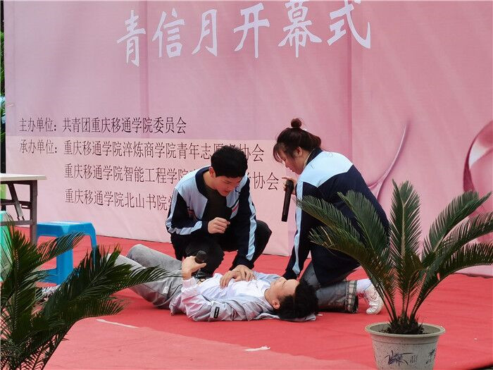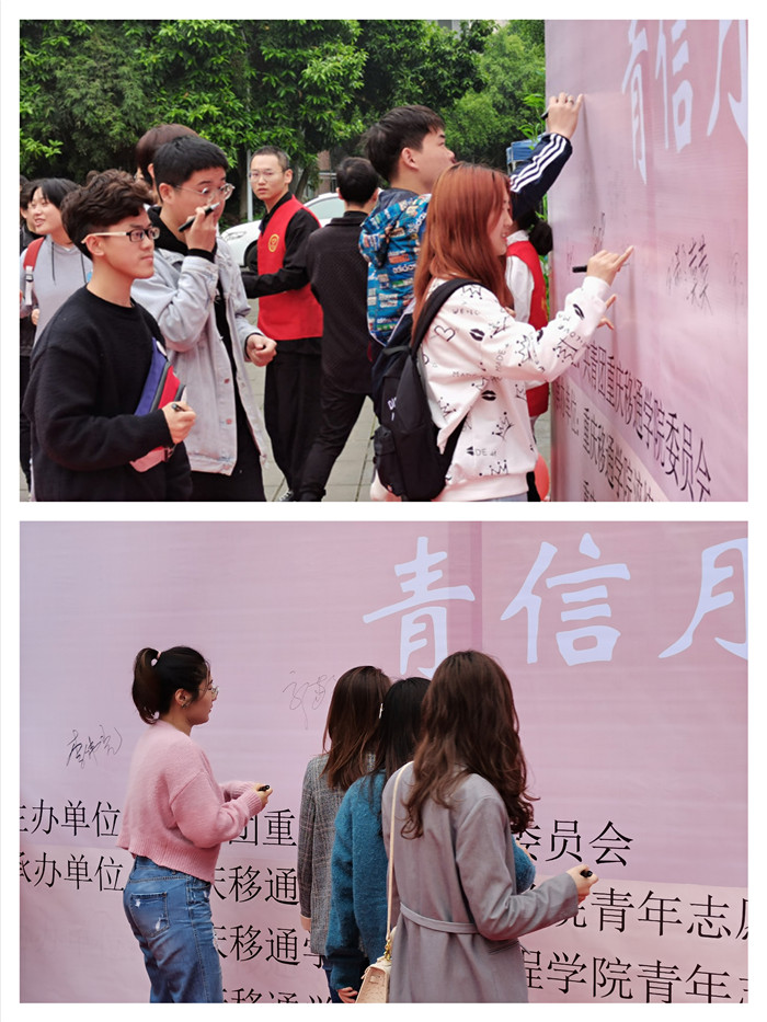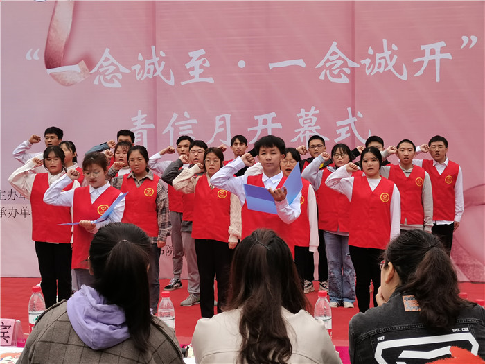 小品的余韵还未消除,开幕式带着欢乐进行到了下一环节。本次活动有幸邀请到校青年志愿者联合会指导老师刘月讲解青年信用体系建设的相关知识,并对重庆移通学院正在进行的青年信用体系建设措施和已取得的成果进行介绍,让在场的同学了解到学校对于青信建设的投入和努力,同时也对大家发出诚信倡导,讲诚信,守信用,以青年之影响力,将青年信用体系贯彻。在主持人的转场下,一批青年志愿者走入现场,“我宣誓:诚实守信,立身之本……诚信伴随人生。”开幕式上响彻黄桷树广场的宣誓声是青年志愿者们对诚信的呐喊,是对坚守青年信用体系许下的诺言。