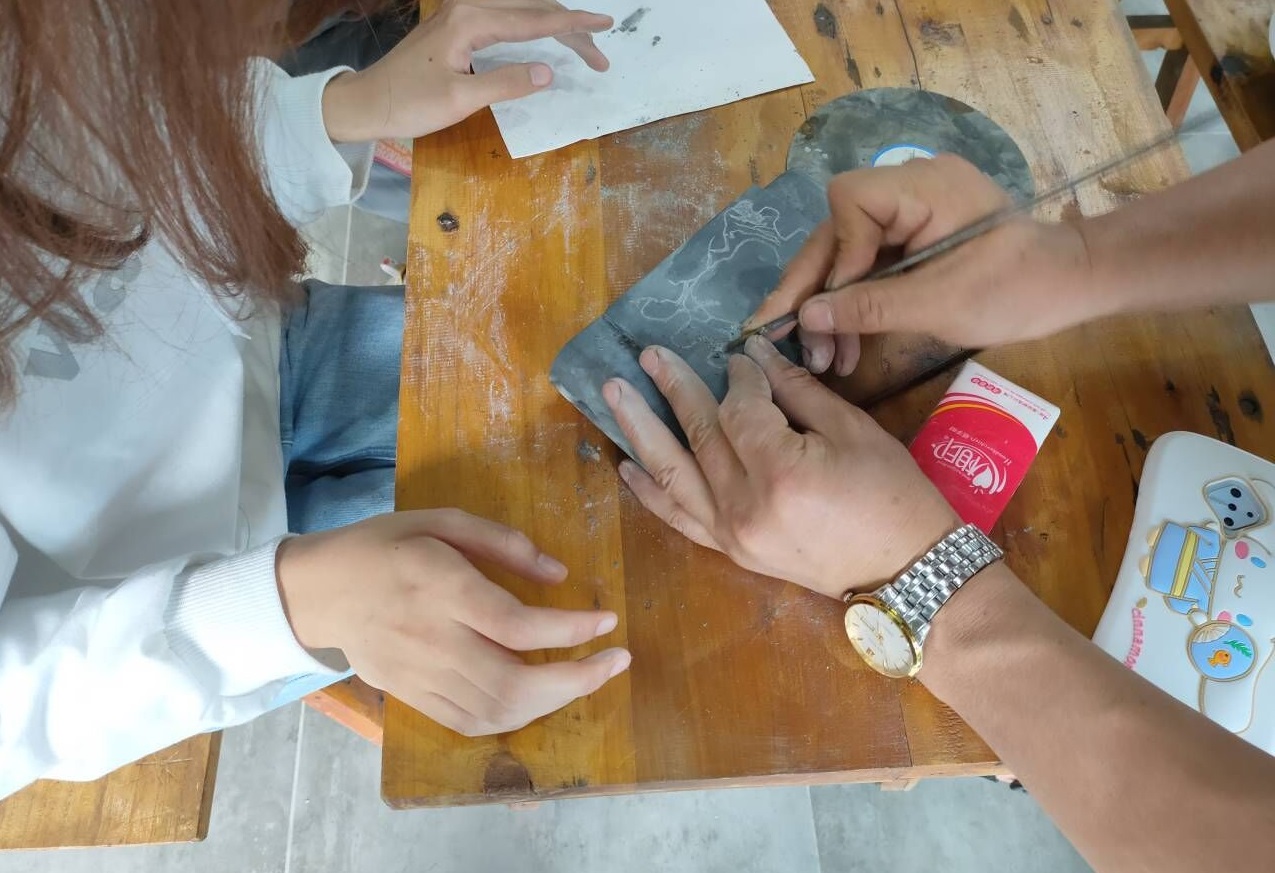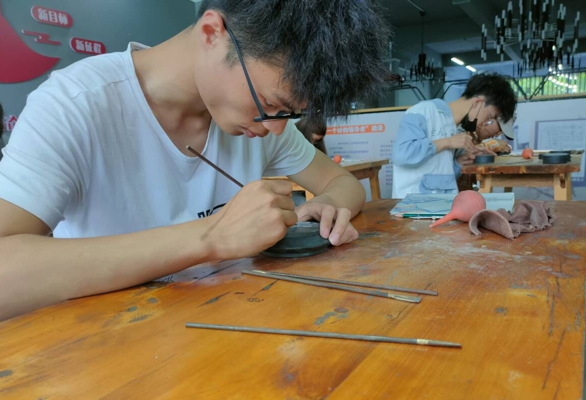 在实践学习过程中,易老师十分和蔼可亲,手把手为同学们进行一对一指导。实践现场的每一个工具该如何运用,以怎样的角度和力度进行雕刻,如何让峡砚更加平滑和圆润,都对同学们的动手能力以及耐心有很大的考验。一件作品需要呈现出峡砚的美,需要不断的打磨和坚持,这一项技艺能够被日复一日的传承,需要花耗传承人的半身心血,凸显了非遗文化传承至今的艰难和曲折。