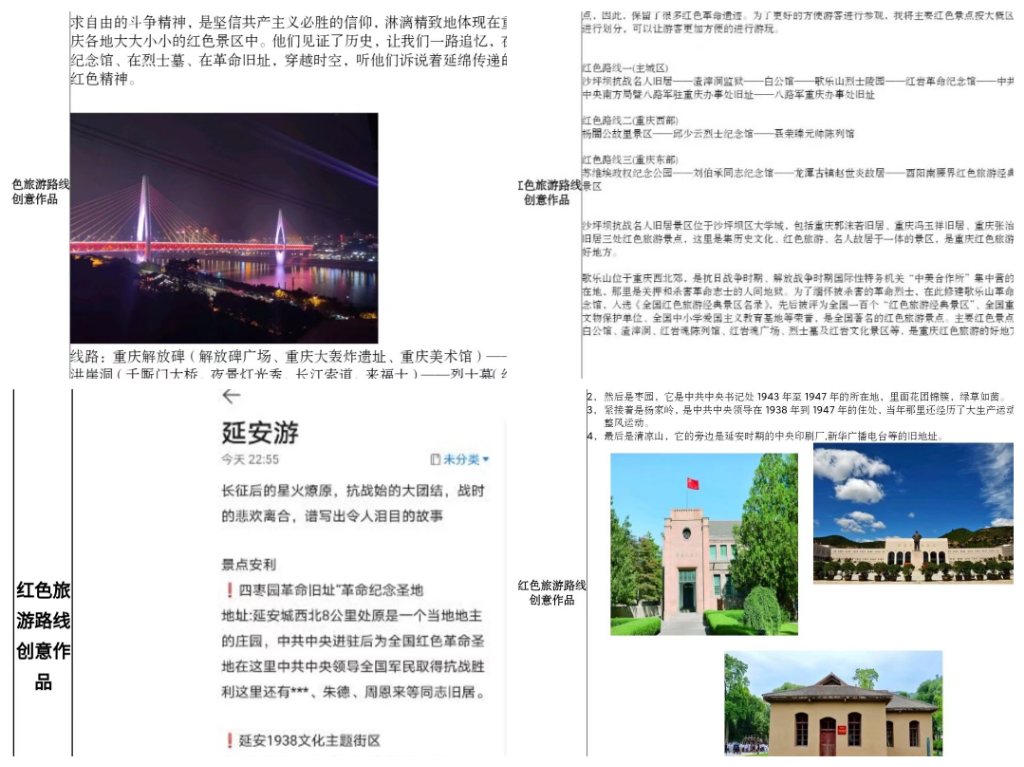 为了在宣传环保意识的同时加强对“红色精神”的链接与继承,以中国共产党成立一百周年为契机,推出了以文化、旅游、环保三方面为主题的大学生红色旅游攻略创意活动。从重庆到北京再到南京,又从长沙来到陕西,顺着同学们的攻略,全国各地的革命圣地都呈现在眼前。每一个地方都有着属于它们的“红色”故事,每一个故事背后的精神都值得每个青年人传承。