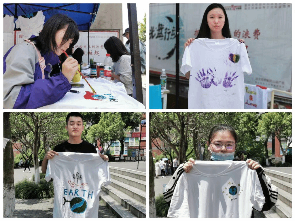 2021年4月29日,志愿者们在三江食堂门口进行了绿色涂鸦活动。T恤上五颜六色的环保图形吸引着同学们的眼球。现场人来人往,同学们迫不及待地领取T恤,脑洞大开,画出了地球、绿叶、手印、英文单词“earth”等等图案。有位同学一边画着一边说:“我的绘画能力不强,但是这个活动很有意义,我希望能用我不强的画技表现我在关注着环保。”绘画不是目,活动的初衷也是希望同学们能通过绘画关注到环境保护,为环保出一份力。