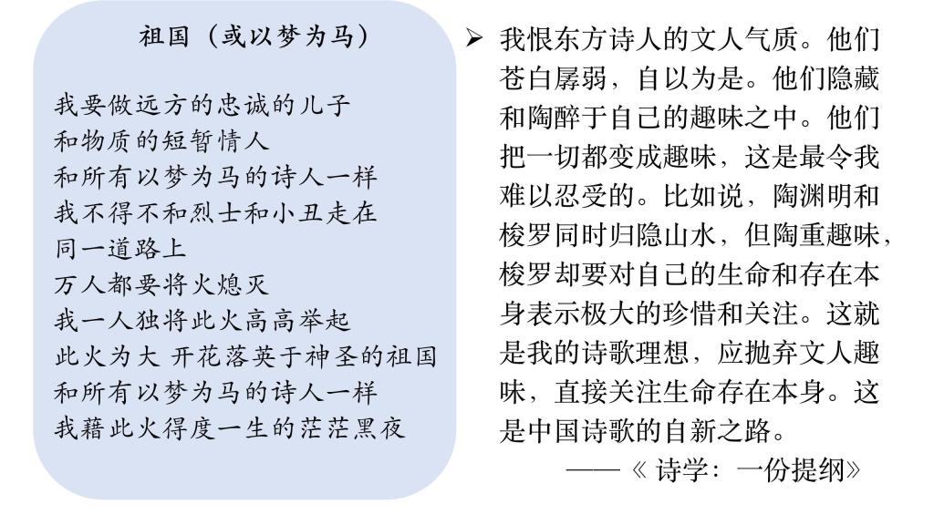 在《祖国(或以梦为马)》中他写道:“我要做远方的忠诚的儿子/和物质的短暂情人/和所有以梦为马的诗人一样/我不得不和烈士和小丑走在/同一道路上/万人都要将火熄灭/我一人独将此火高高举起/此火为大 开花落英于神圣的祖国/和所有以梦的马的诗人一样/我藉此火 度一生的茫茫 万人都要将火熄灭,我一人独将此火高高举起。”这里的火与荷尔德林《故乡》里的火一样,与海子对荷尔德林诗的理解中的火一样。有的诗人陶醉于趣味之中,他们把一切都变成趣味。而荷尔德林和海子所追求的则是对生命存在本身的珍惜与关注。