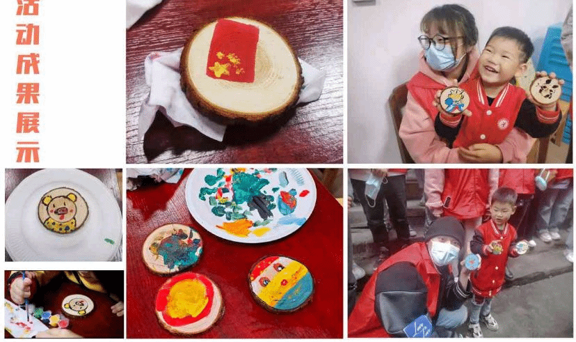 经过简短的自我介绍后,活动正式开始。许多家长朋友们站在小朋友们身后,欣喜的望着眼前沉浸于绘画乐趣的孩子们,志愿者陪伴小朋友们左右,执手画笔、细语指导,小朋友们渐渐在小木轮片上留下他们对“祖国的春天”的绘画笔迹:红色的五星红旗随风飘扬庆祝着祖国的繁荣、绚丽的花朵簇放赞美着祖国的美好未来……门外的小空地上,志愿者们领着小朋友们踢毽子,踢皮球,欢乐美好的童年时光在这个下午静静流淌,滋润志愿成长。