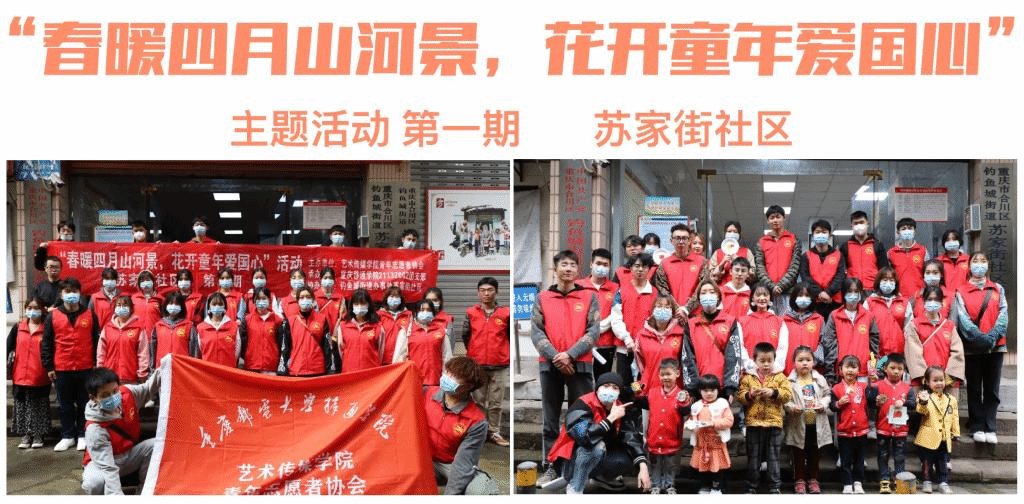 为引导小朋友们从小树立正确的人生观、价值观,激发爱国爱家乡的热情,2021年4月7日,艺术传媒学院青年志愿者协会携手艺术传媒学院廖国臣老师、重庆移通学院21132002班团志愿服务支队的同学们共同走进苏家街社区,开展“春暖四月山河景,花开童年爱国心”第一期主题活动。此次活动通过绘画“祖国的春天”庆祝祖国的繁荣;“祖国山河景,剪贴‘红色’记忆”剪贴画等形式带领小朋友们学习领略爱国精神文化,绽放童年爱国心。