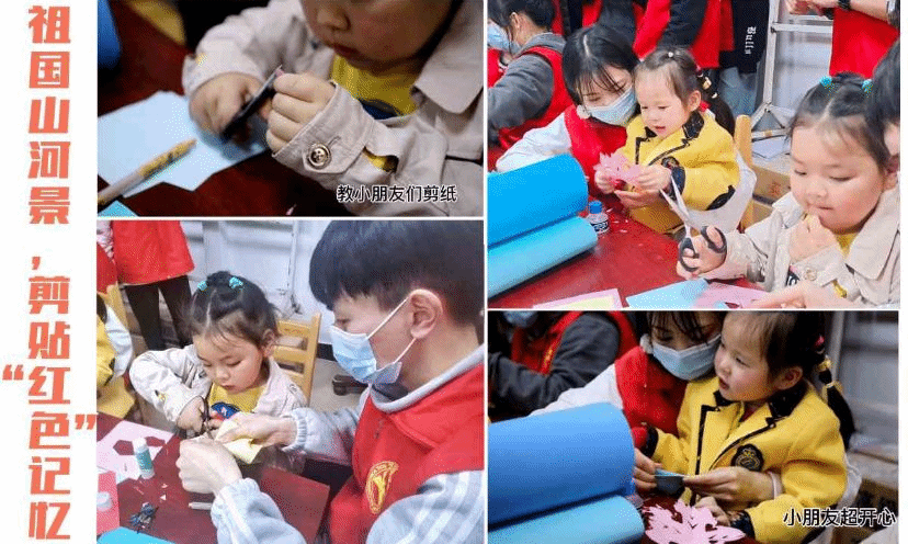 “祖国山河景,剪贴‘红色’记忆”剪贴画创作中,志愿者向小朋友们讲述过去历史的“红色”故事、现在的“红色”精神,与小朋友们剪出丰富的“红色”代表物,拼接粘贴在纸上,共同宣传爱国文化,温暖爱国心。