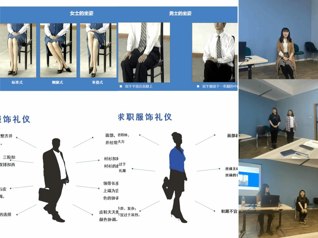 职场着装礼仪是职场中重要的一部分。随后,陈婷婷老师就职场中的着装礼仪为同学们一一进行阐述。不仅与线上的同学进行留言讨论,还在线下进行示范并带动学生一起参与。陈婷婷老师就同学们的不同坐姿站姿给予纠正,让大家更加注重谈吐、行为、穿着等多个方面的礼仪。最后伴随着老师对我们的美好祝愿活动也就此结束了。
