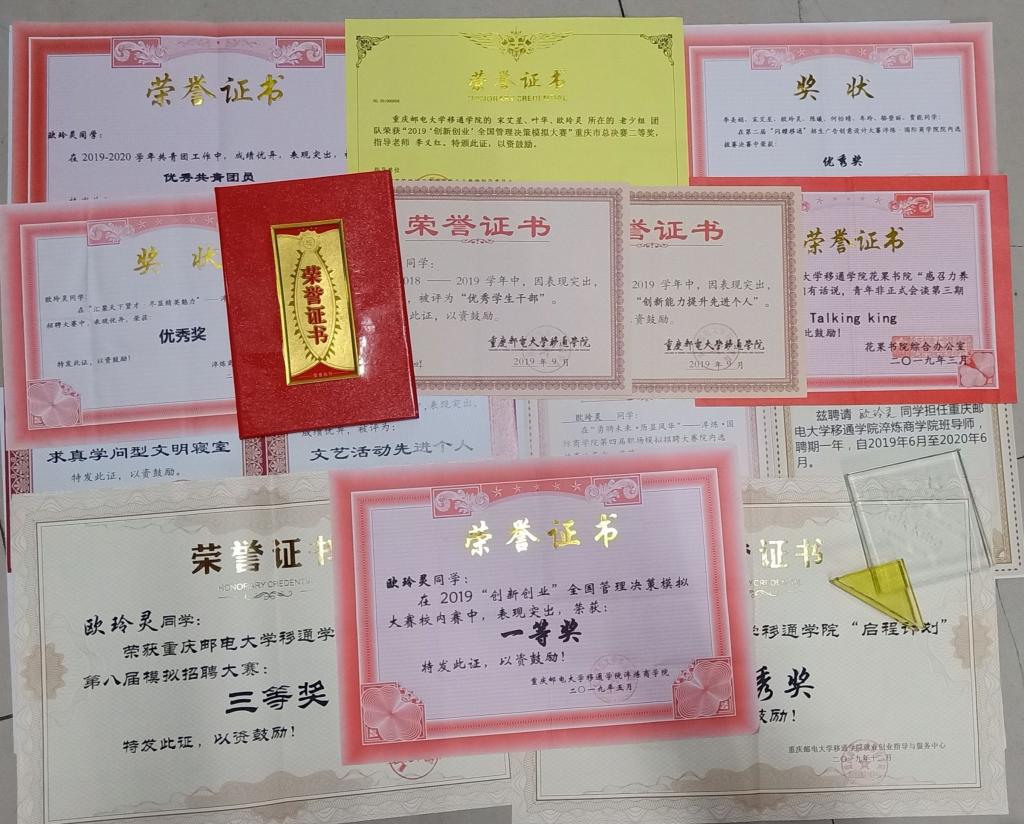 在校期间认真学习,积极参加并组织完满教育活动,荣获优秀共青团员、优秀学生干部、文艺活动先进个人、创新能力提升先进个人、勤工助学先进个人,重庆市全国决策模拟大赛总决赛二等奖、第八届模拟招聘大赛三等奖、“知信杯”青年信用知识大赛三等奖、带领寝室蝉联校级“文明寝室”、花果书院“感召力养成计划”—我们有话说,青年非正式会谈第三期Talking king等奖项。