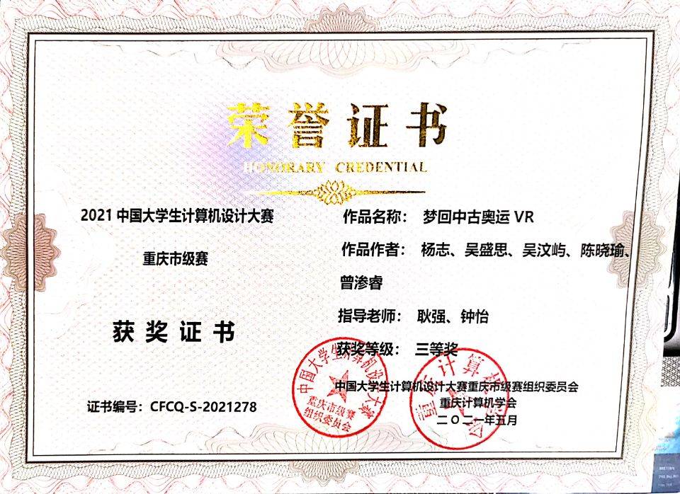 2021年5月,《梦回中古奥运》VR,一款全新打造高度还原古代体育竞技场景的VR产品,其中互动项目包扩射箭、投壶、木射和锤丸等,这款产品参与全国计算机大赛,并一举多得重庆赛区三等奖,这是GEEK(极客)VR工作室成立大半年来的第一个荣誉,未来相信还有更多荣誉会来到极客,但对于杨志来说,接下来的荣誉应该属于下一代的负责人了,他大四了,同样面临学习与工作的矛盾,杨志说: