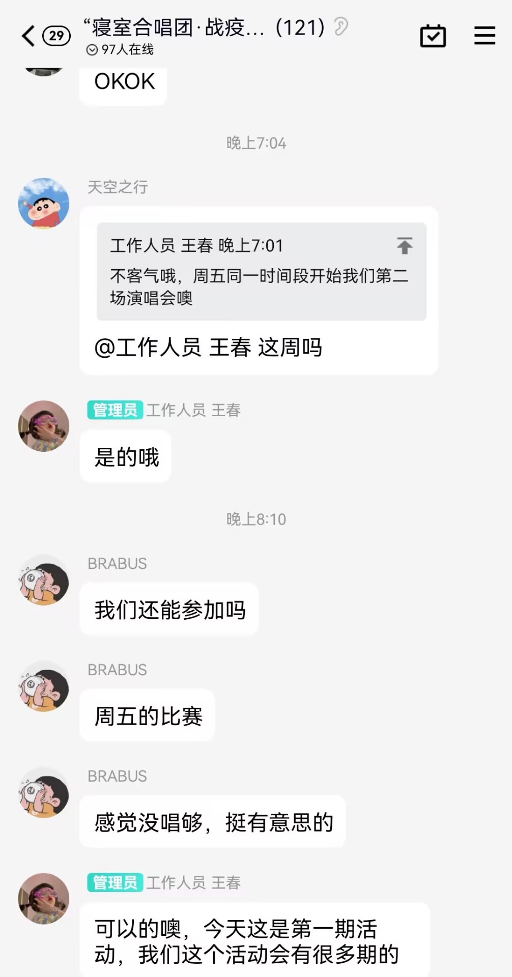 参赛同学们自主选择歌曲,由寝室组队进行连麦合唱。音乐响起的那一刹,就像是心中的期盼被点燃,寝室成员们都加入了合唱行列。不约而同的是大家都在互动和音乐的开头结尾中彼此加油鼓劲,寄予力量。在活动结束后,不少同学找到工作人员反馈线上k歌让他们更加勇敢,是一个很好的锻炼和展示机会,在这段特殊的寝室生活里能够更好地释放情绪,缓解压力。k歌+寝室创造了无限可能,k歌+社交实现了交流碰撞,k歌+合唱释放了情绪与压力。或许参赛的同学们都不是唱歌比赛里的k歌之王,但一起加油,共克时艰,放声合唱的你们却都是汇江书院老师和同学们心中的“k歌之王”。