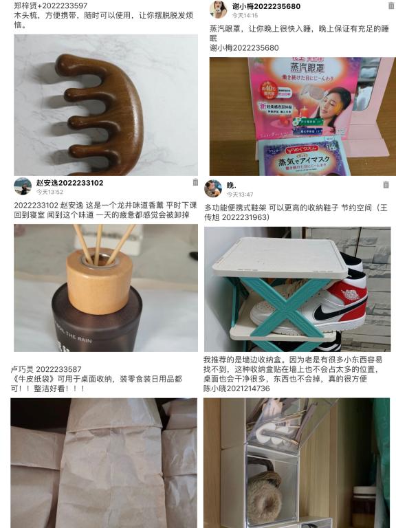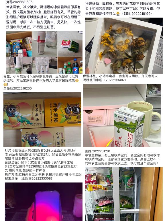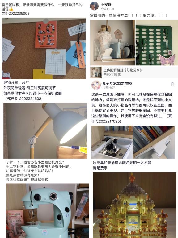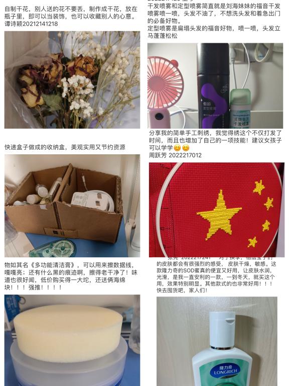 疫情当下,为给移通学子平淡的隔离生活增添乐趣,少一些焦虑。爱莲书院举办了“和焦虑Say Bye Bye,情绪转换Five Days”一平米系列活动。本次活动共分为5期。分别为“物超所值”、“你的手帐超好看”、“表情,包你满意”、“信件盲盒计划”和“寝室日记Vlog”。11月正恰逢双十一购物节,第一期“物超所值”首当其冲,同学们通过本次活动都尽情分享了自己平时所购的平价实用好物,旨为在双十一当晚到来前安利给更多需要的同学。本期活动共计收集了近400份来自同学们的好物分享,有让人受益的书籍、手工制作好物、收纳好物、追剧下饭神器、室内健身好物、多功能清洁膏等小众好物。疫情当前,移通学子们纷纷展示了他们乐观积极的一面,用心生活,将好物传递,也将更多正能量传递给身边人!