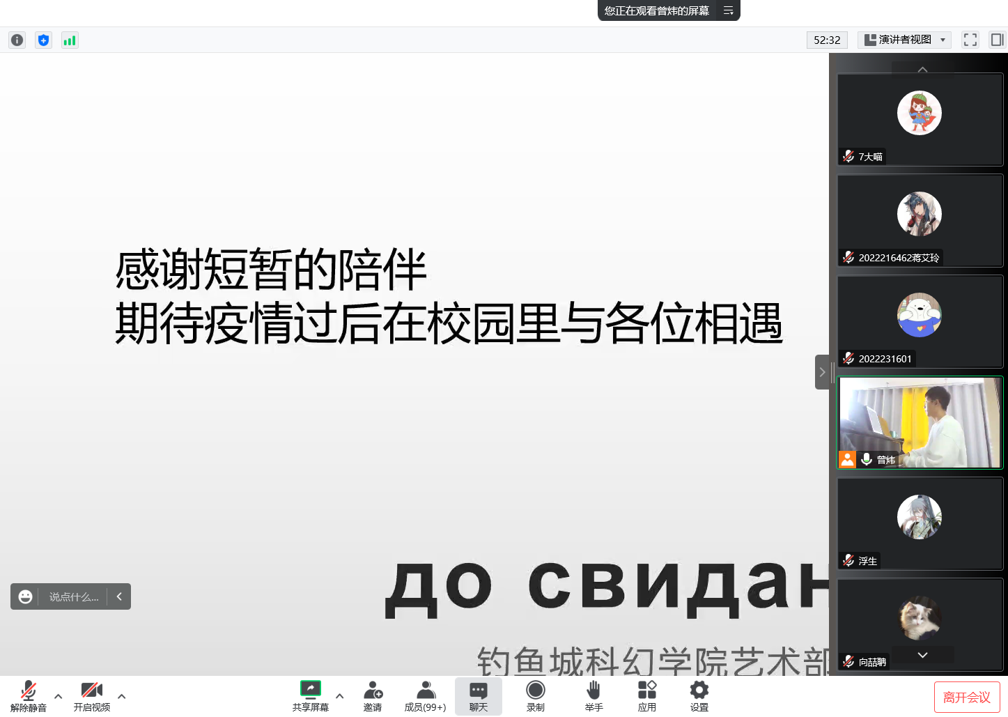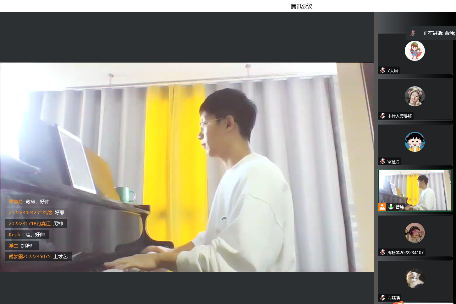钓鱼城科幻学院曾炜老师通过俄罗斯战斗民族精神的生动讲解,不断鼓励同学们配合防疫工作、勇敢面对目前困难;并在云端为同学们弹奏了《裹着心的光》《 F 大调圆舞曲》《 Warm Affection 》三首钢琴曲,借助优美的音乐缓解同学们的心理压力。
