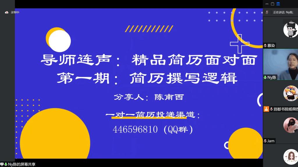 为保障别都家人专属权益,拓宽书院学子求职视野,增强战疫信念,本周以来,别都书院结合学生年级、专业等实际情况,全新推出求职定制栏目——导师连声:精品简历面对面,通过直播讲授、一对一指导的方式,为书院家人的求职之路提供专属加油包。11月9日下午16:00,别都书院发展导师陈南西以“简历内容撰写逻辑”为主题阐述云端初阶职场攻略,通过简历结构分析、三步法阐述、撰写逻辑梳理等内容的讲授,同时别都书院全体老师也就实时投递的简历进行一对一指导,为书院学子简历制作提供优化思路。满血复活不输气场,重整旗鼓不褪本色。在这个共克时艰的战疫时刻,别都人从不惧职场和战场,相信每一位别都家人都可以职通未来,战则必胜!