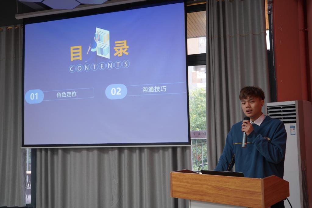 如何进行角色定位?毕广建学长指出学生干部的定义及作用,随后从三个角度进行阐述:将心比心——班委是组织、维系同学们和谐关系的纽带,在组织大家共同参与班级事务时,应善于听取同学们的意见,尊重合理想法,避免在细节问题上与班级同学起争执;心平气和——班委需要以信任的心态面对矛盾和分歧,避免带着“敌对心态”去理解和解释的情况。听听他们所想表达的想法,用信任的态度看待同学,耐心听取他们的意见;合作共赢——同学之间需要建立一个友爱、团结和谐的人际关系,创造一个良好的集体心理氛围。班委可以通过组织同学参与活动,以此创造交流机会,善于倾听,并进行合理的采纳。