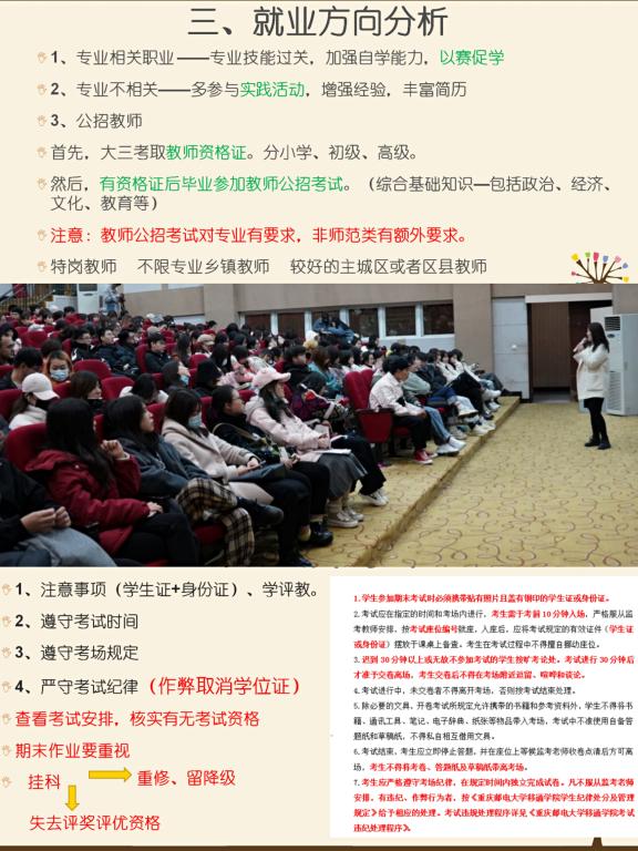 2019级广播电视编导专业全体学生于12月30日上午10点在3302教室召开了“2020-2021学年第一学期总结会暨就业创业指导工作会”。年级会建立在前期学生对于本学期的反馈,如:没有准确的就业方向、对于各类学分划分不够清晰,辅导员陈婷婷通过学期总结、专业培养方案解读、就业方向分析等几个方向为全体学生进行了解读和现场指导。对于我校“四位一体”育人模式再次进行解读,引导学生要均衡各个方向的发展,在学好专业课程的同时,不断积极参与各项实践活动,进一步提升自身综合素质。同时,临近期末,陈老师在会上对同学们进行了诚信考试教育,引导学生积极备考、诚信考试。对即将到来的元旦假期和寒假进行安全提醒,在疫情防控常态化的状态下,做好往返以及假期的安全工作。并积极利用假期时间不断充实自己,为下学期制定目标,不断奋斗。