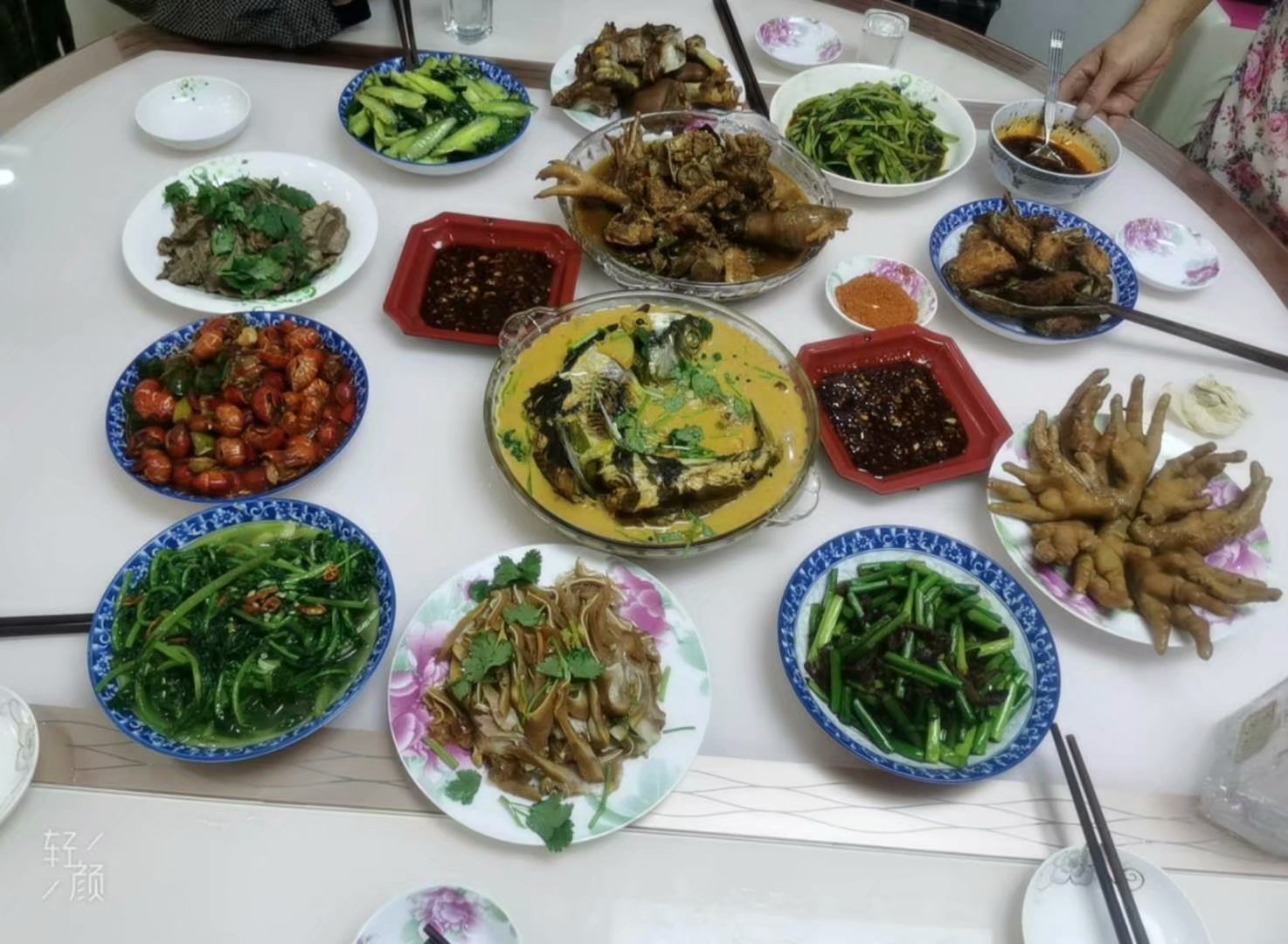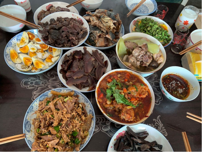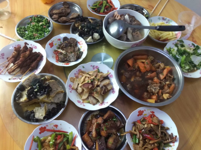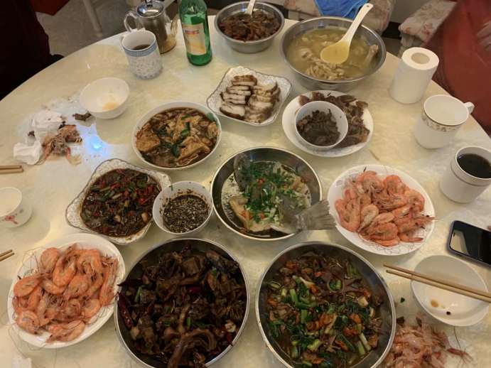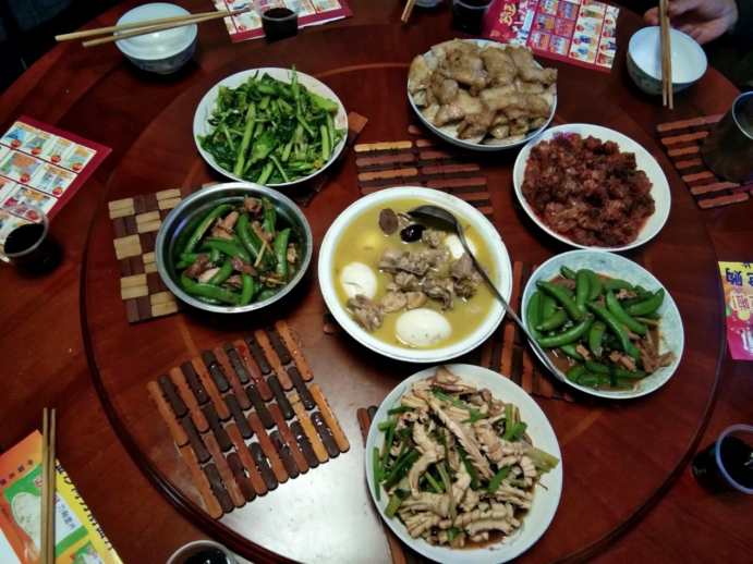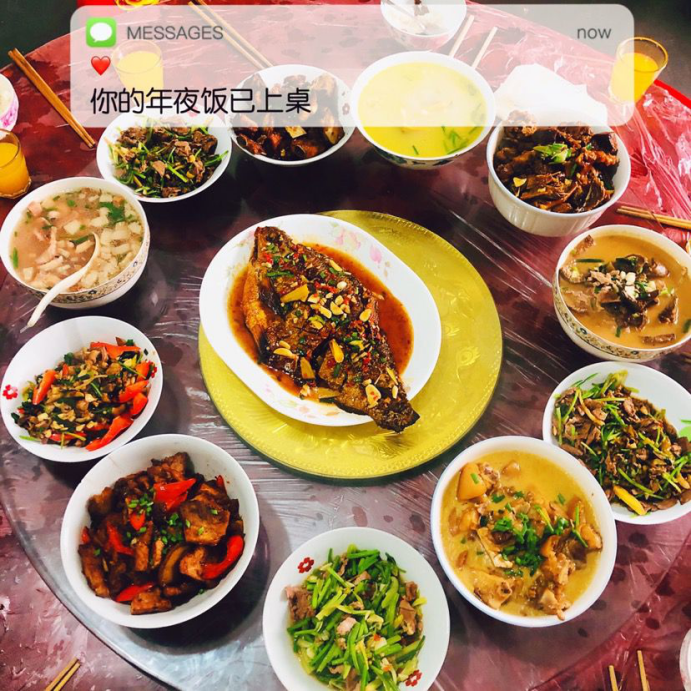 我家团年饭有葱油鸡、油焖大虾、樱桃肉、豆豉鱼、酥肉圆子汤、香肠等,虽然都是些普通的菜,但是这是一大家子人共同努力的结果,年味也是满满的!
