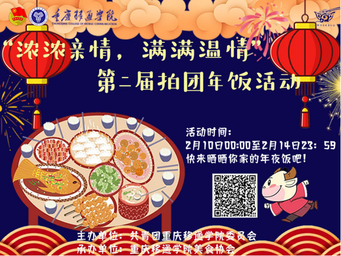 岁末年初之际,为弘扬中华传统饮食文化,表达团圆的期许与祝福,留下美好回忆。重庆移通学院美食协会开展“浓浓亲情,满满温情”第二届拍团年饭活动。