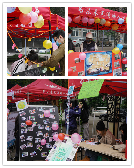 在布置完成后,各个团支部的成果也逐渐展露出来。完超活动照片及视频、完超日记、完超作品、一张张匠心独运的照片,一幅幅栩栩如生的作品都成为了黄桷树广场上一道靓丽的风景线。支部成员们在自己支部展示台处不断为来来往往经过的同学们进行介绍自己团支部的完超活动和文化展示,现场吸引了众多学生和老师们的驻足观赏。